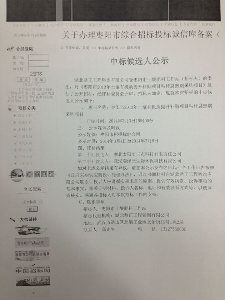 棗陽市2013年土壤有機質提升補貼項目秸稈腐熟劑采購