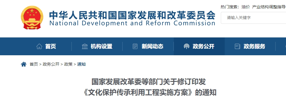 日前,國家發(fā)展改革委會同住房城鄉(xiāng)建設(shè)部、中央宣傳部、文化和旅游部等部門對《文化保護傳承利用工程實施方案》進行了修訂。
