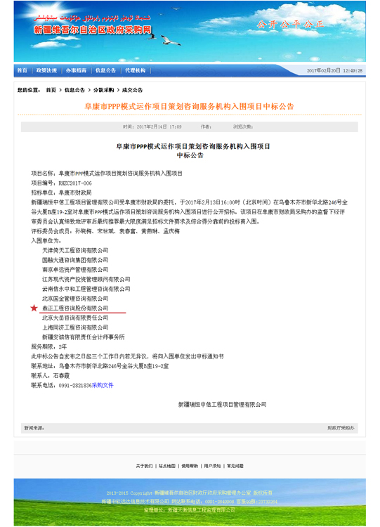 近日,新疆維吾爾自治區采購網公布了阜康市PPP模式運作項目策劃咨詢服務機構入圍項目中標公告,我司成功入圍。
