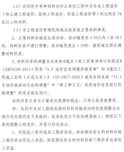 三是發承包雙方簽訂發承包合同時,應在合同中明確可調價的主要材料范圍,合理約定主要材料價格波動的風險幅度及超出幅度后的調整辦法,公平分擔主要材料價格波動造成的風險,以保障工程的順利實施。