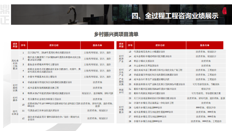 鼎正始終踐行“以全過程工程咨詢及PPP全生命周期咨詢服務為先導、以投資管控為主線、以項目增值為目標”的一站式工程咨詢服務理念,積極探索參與鄉村振興的領域與路徑,緊跟鄉村振興新動向,充分發揮工程咨詢企業高智力支撐作用,干出工程咨詢新作為!