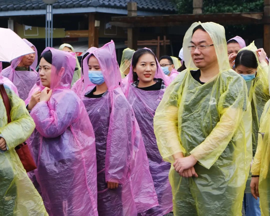 活動當天雖當天上午持續(xù)陰雨連綿,但是出游的同事們并未停下腳步,路途大巴上交談甚歡載歌載舞,欣喜之情溢于言表,穿上花花綠綠的雨衣在雨霧中穿行,在東湖磨山水墨畫一般的景色中劃出一條彩色的長線,亦是一道別樣的風景。