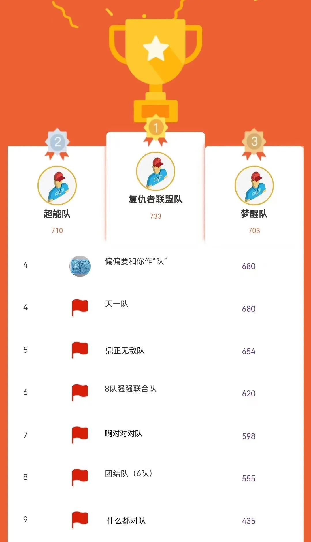 大家好,我們是“偏偏要和你作‘隊(duì)’”、“強(qiáng)強(qiáng)聯(lián)合隊(duì)”、“復(fù)仇者聯(lián)盟隊(duì)”、“鼎正無(wú)敵隊(duì)”、“啊對(duì)對(duì)對(duì)隊(duì)”、“超能隊(duì)”、“天一隊(duì)”、“團(tuán)結(jié)隊(duì)”、“夢(mèng)醒隊(duì)”、“什么都對(duì)隊(duì)”。