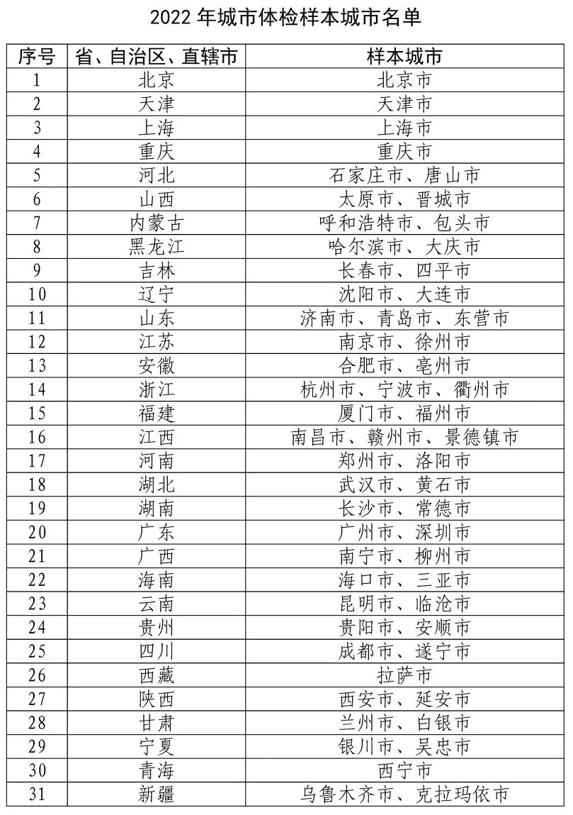 為深入貫徹習近平總書記關于建立城市體檢評估機制的重要指示精神,落實中共中央辦公廳、國務院辦公廳印發的《關于推動城鄉建設綠色發展的意見》部署要求,經協商研究,在歷年城市體檢工作基礎上,決定繼續選取直轄市、計劃單列市、省會城市和部分設區城市(見附件1,以下簡稱樣本城市)開展2022年城市體檢工作。現將有關事項通知如下: