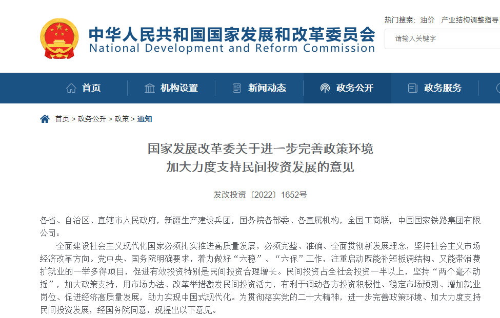 全面建設社會主義現(xiàn)代化國家必須扎實推進高質(zhì)量發(fā)展,必須完整、準確、全面貫徹新發(fā)展理念,堅持社會主義市場經(jīng)濟改革方向。黨中央、國務院明確要求,著力做好“六穩(wěn)”、“六保”工作,注重啟動既能補短板調(diào)結構、又能帶消費擴就業(yè)的一舉多得項目,促進有效投資特別是民間投資合理增長。民間投資占全社會投資一半以上,堅持“兩個毫不動搖”,加大政策支持,用市場辦法、改革舉措激發(fā)民間投資活力,有利于調(diào)動各方投資積極性、穩(wěn)定市場預期、增加就業(yè)崗位、促進經(jīng)濟高質(zhì)量發(fā)展,助力實現(xiàn)中國式現(xiàn)代化。為貫徹落實黨的二十大精神,進一步完善政策環(huán)境、加大力度支持民間投資發(fā)展,經(jīng)國務院同意,現(xiàn)提出以下意見。