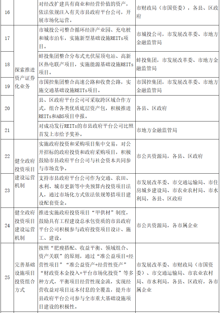 6.探索推進資產證券化業務。市城投公司整合循環經濟產業園、充電樁和城市泊車,實施新型基礎設施REITs項目;蚌投集團整合分布式光伏屋頂電站、高新區熱電聯產項目,實施能源基礎設施REITs項目;市國控集團整合高速公路和收費公路,實施交通基礎設施REITs項目。縣、區政府平臺公司可采取跨區域合作方式,組合各類優質底層資產包,積極推進REITs和ABS項目申報。2025年底前,市屬企業力爭發行REITs不低于2支,募集資金規模不低于50億元。對成功發行REITs的市縣政府平臺公司比照首發上市給予獎補。(責任單位:市發展改革委、市地方金融監管局、各縣、區政府,各市屬企業)