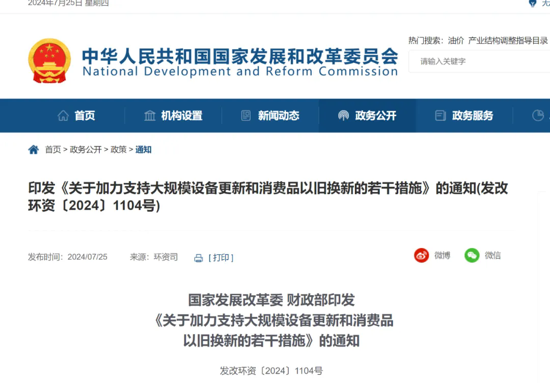 近日,國(guó)家發(fā)展改革委、財(cái)政部聯(lián)合印發(fā)《關(guān)于加力支持大規(guī)模設(shè)備更新和消費(fèi)品以舊換新的若干措施》的通知(發(fā)改環(huán)資〔2024〕1104號(hào)),統(tǒng)籌安排3000億元左右超長(zhǎng)期特別國(guó)債資金,加力支持大規(guī)模設(shè)備更新和消費(fèi)品以舊換新。