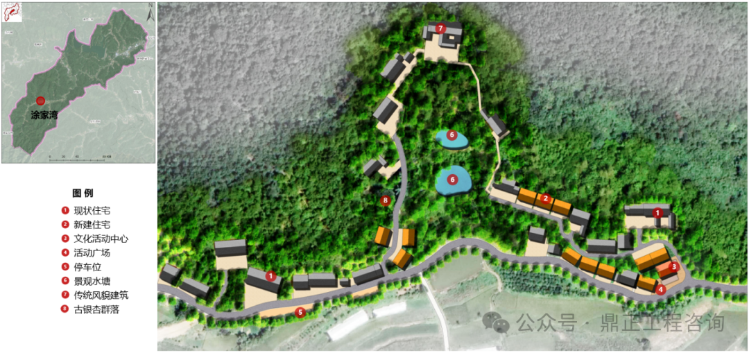 九口堰村為滿足村莊集并及遠期人口增長需求,規劃于涂家灣設置一處居民安置點。場地現狀民居較多,地形高差大,通過梳理現狀閑置宅基地、拆除破舊房屋等措施整理出可以進行布局居民點的建設用地,點狀布局居民點,居民點每戶占地140平方米,共安置12戶。