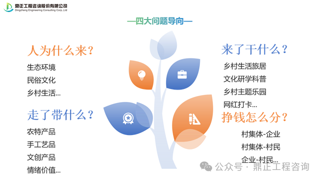 圍繞人為什么來、來了干什么、走了帶什么、掙錢怎么分四大問題去思考鄉村該怎么運營,去明確鄉村的主題定位、發展方向、核心產品、運營方式,更好地推進鄉村運營。
