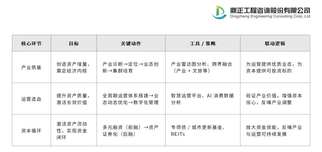 城市更新的本質是“產(chǎn)業(yè)價值發(fā)現(xiàn) — 運營價值提升 — 資本價值實現(xiàn)”的過程。通過產(chǎn)業(yè)精準定位創(chuàng)造資產(chǎn)增量,運營精細化管理提升資產(chǎn)質量,資本工具創(chuàng)新激活資產(chǎn)流動性,最終形成“產(chǎn)業(yè)筑基 — 運營造血 — 資本循環(huán)”的可持續(xù)生態(tài),推動城市從“空間更新”邁向“價值再生”。