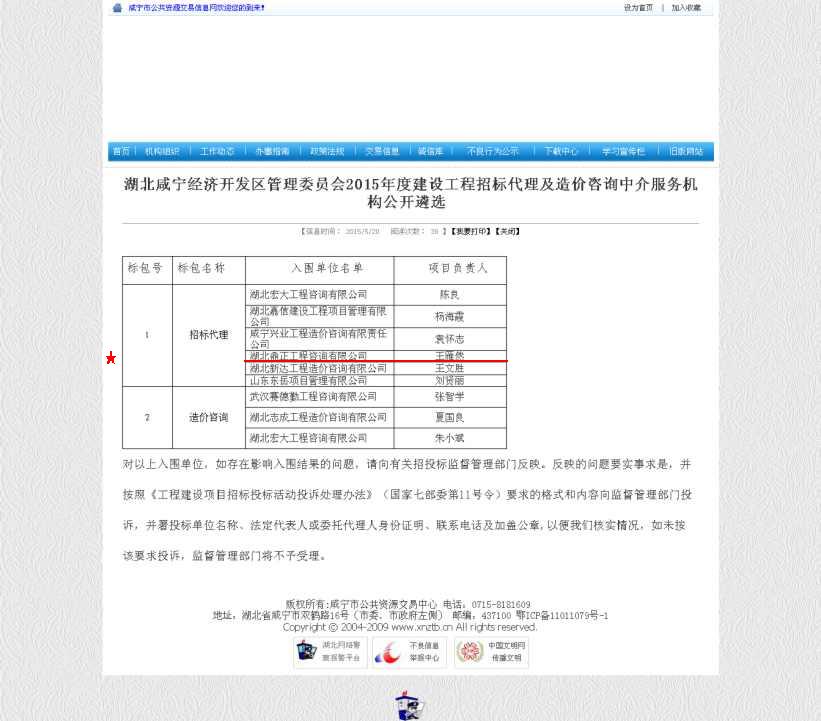 【經營成果】我司入圍湖北咸寧經濟開發區管理委員會2015年度建設工程招標代理及造價咨詢中介服務機構庫招標代理單位
