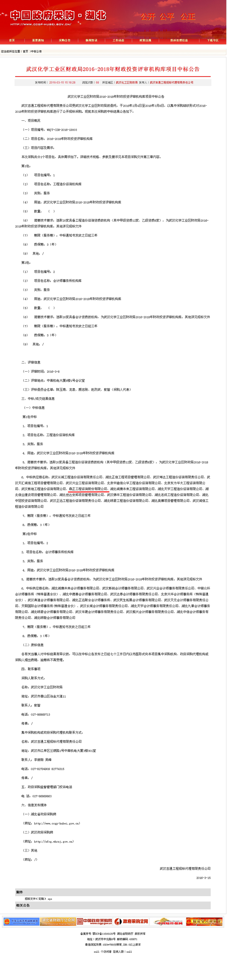 【經營成果】我司入圍武漢化學工業區財政局2016-2018年財政投資評審機構庫