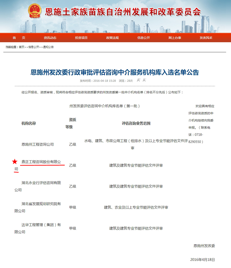 【經(jīng)營成果】我司入圍恩施州發(fā)改委行政審批評估咨詢中介服務(wù)機構(gòu)庫