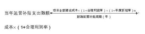 對可行性缺口補助模式的項目,在項目運營補貼期間,政府承擔部分直接付費責任。政府每年直接付費數額包括:社會資本方承擔的年均建設成本(折算成各年度現值)、年度運營成本和合理利潤,再減去每年使用者付費的數額。計算公式為: