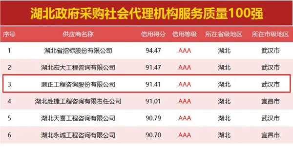 繼榮獲全國政府采購百強代理機構榮譽后,現由政府采購大數據研究院和政府采購大數據網聯合發布的湖北省政府采購社會代理機構服務質量100強榜單,鼎正榮登湖北省政府采購社會代理機構服務質量百強,名列三甲。
